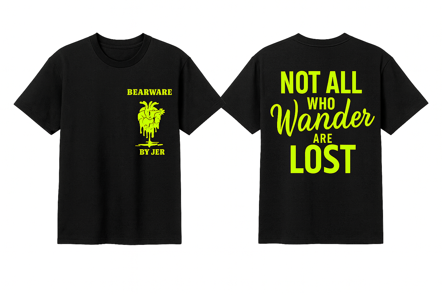 Black tee with Bearware by Jer neon heart on the front and