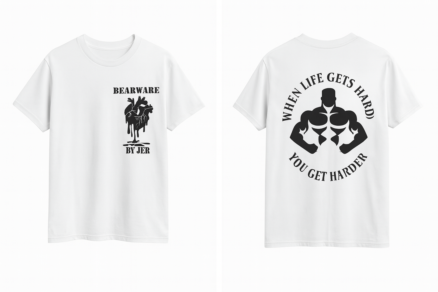 White tee with Bearware heart on front and strong silhouette graphic with 'When Life Gets Hard You Get Harder' text.